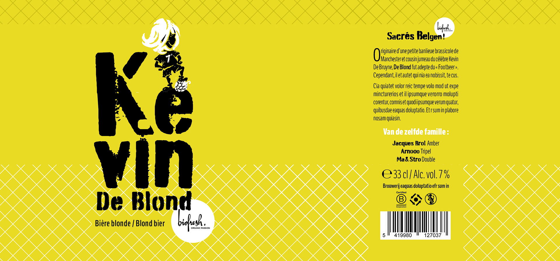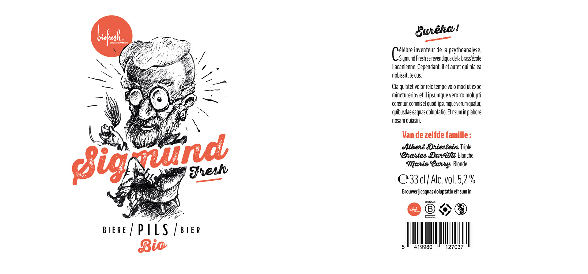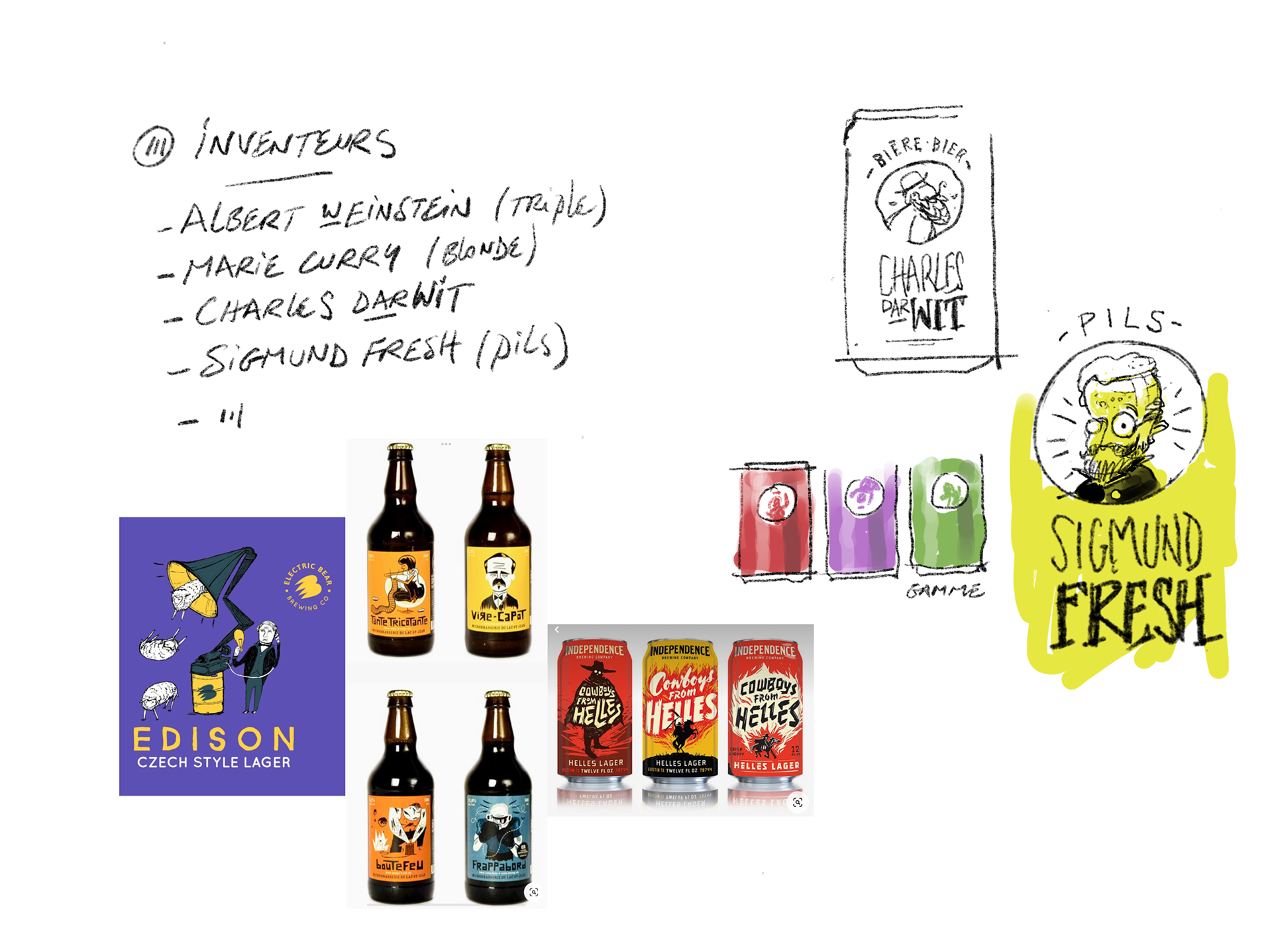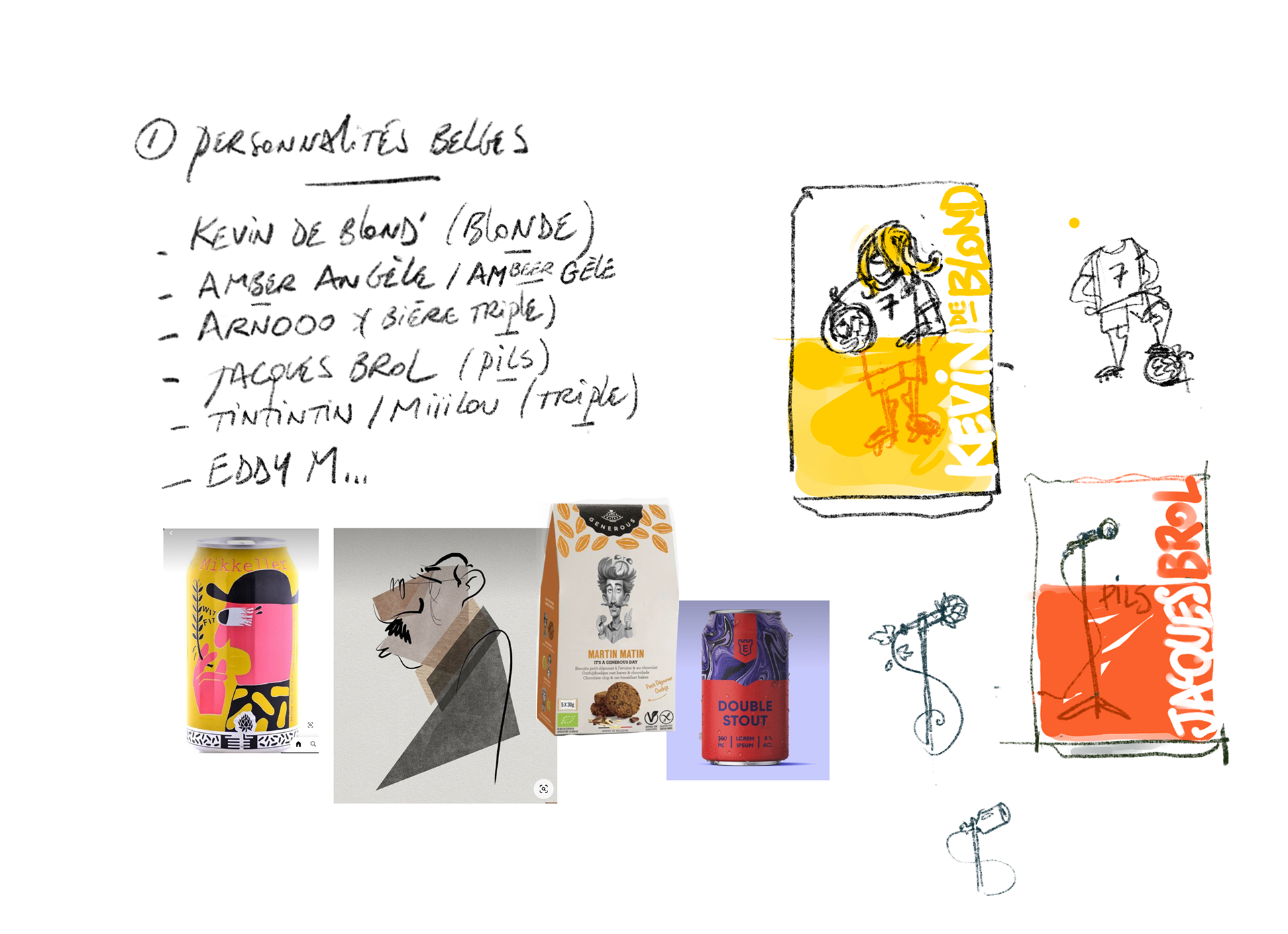 Projets pour une gamme de bières ludiques suivant la thématique des personnalités belges, inventeurs, animaux,... Le clin d'œil est aussi bien visuel que textuel.