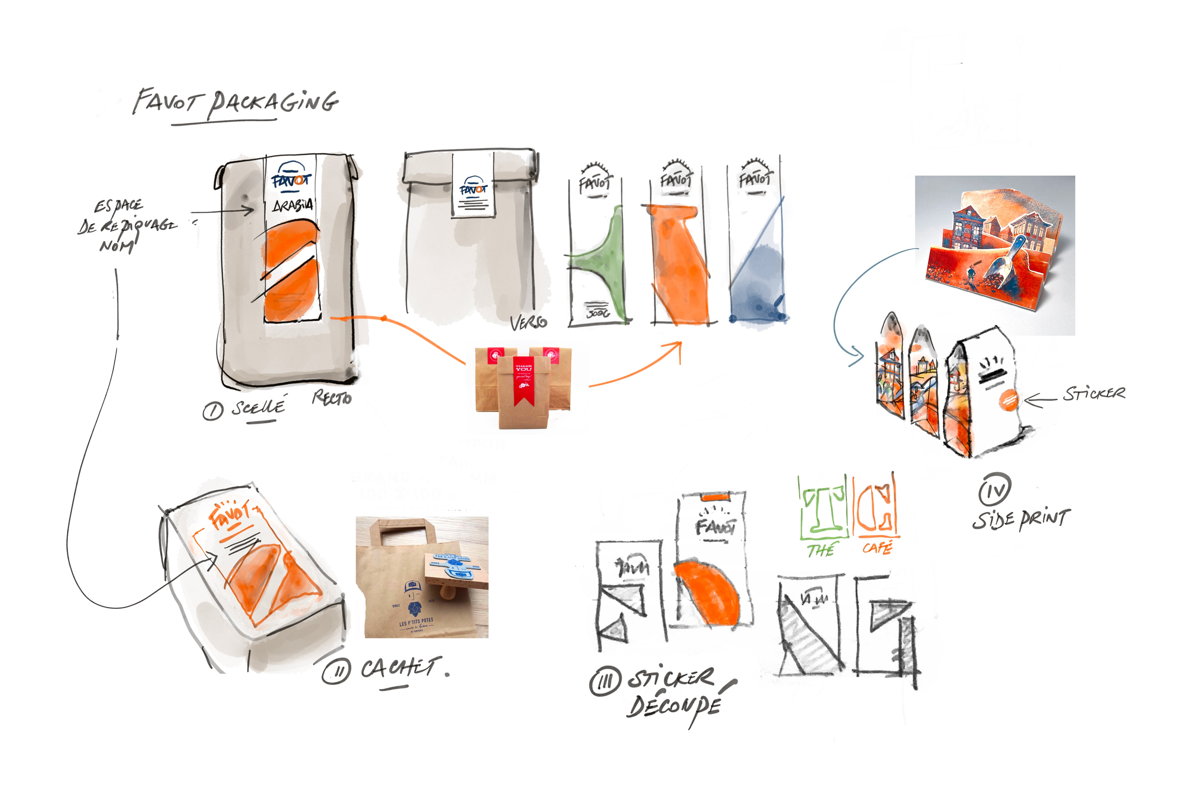 Avant-projets présentés sous forme de rough. Plusieurs options de personnalisation sont proposées: soit le packaging est directement imprimé, soit on y applique le logo à l'aide d'un cachet, la variété étant indiquée par un sticker.