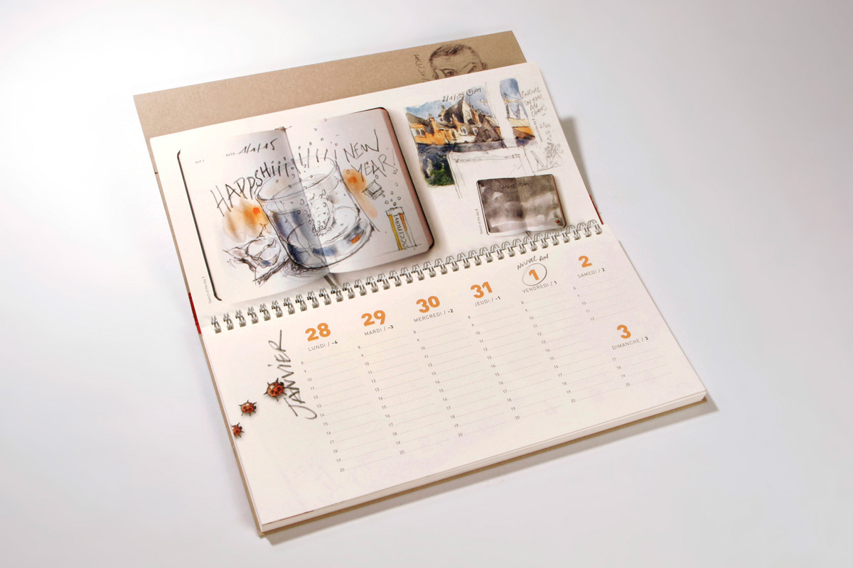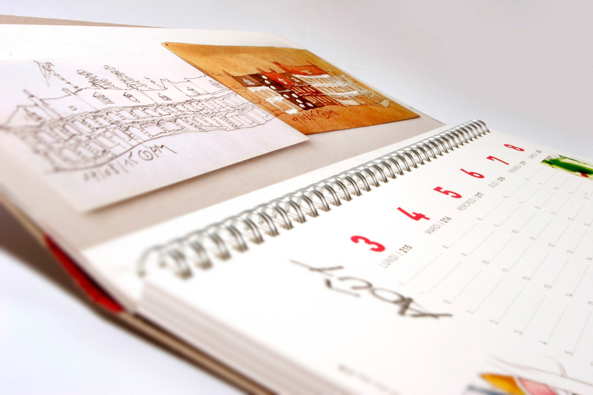 Agenda conçu à partir des croquis et photos réalisés dans la lignée du projet « One sketch a day in 2015 ». La plupart des dessins ont été réalisés sur le motif. Les techniques sont l'aquarelle, le dessin au crayon ou bic sur carnet Moleskine.