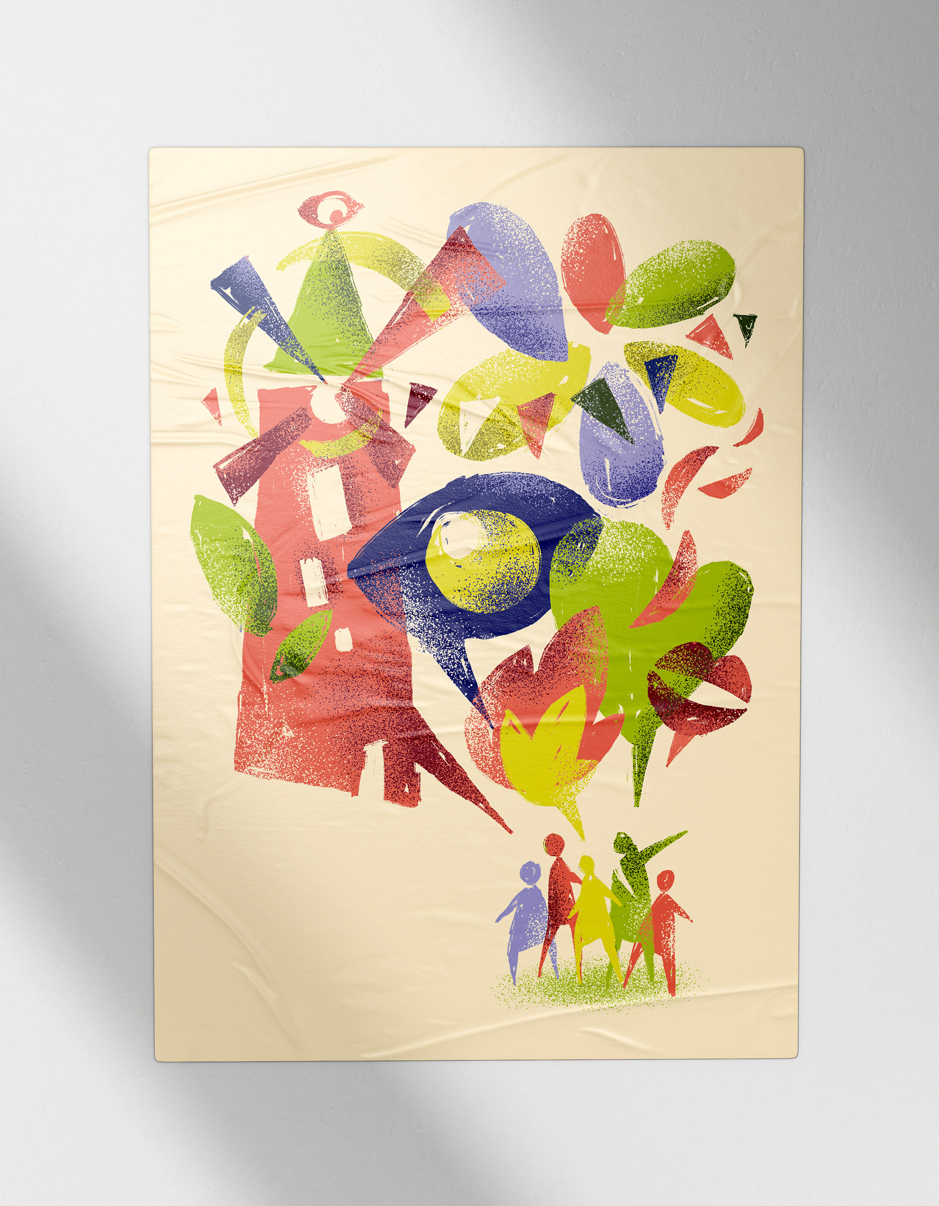 Cette série de visuels illustre la démarche de conception du visuel et de son évolution suite aux remarques du client. La première étape consiste en un avant-projet présenté sous forme de rough. Après validation de celui-ci par le client, la mise au net de l'illustration (étape 2) est réalisée. Dans ce cas-ci, exceptionnellement, le client a souhaité quelques changements. Un nouveau crayonné a été conçu en vue d'une nouvelle validation avant mise au net (étape 4). En phase 5, l'illustration en situation. On la trouve en cover de brochure. Les différents éléments la composant sont également déclinés séparément en pages intérieures.
